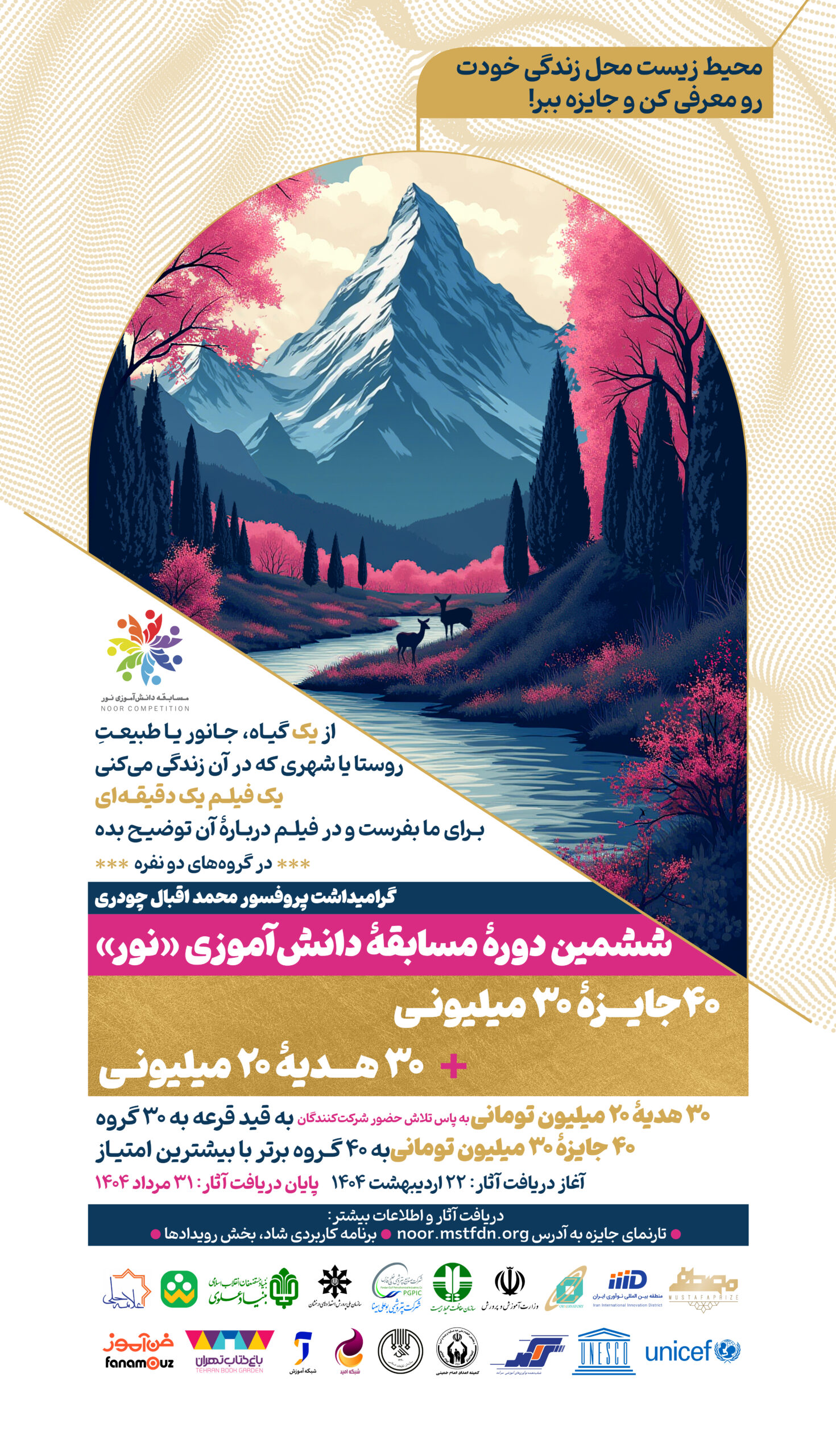 جوایز این دوره شامل ۴۰ جایزه ۳۰ میلیون تومانی برای آثار برتر و ۳۰ جایزه ۲۰ میلیون تومانی با قرعه کشی است. فراخوان این دوره در اردیبهشت 1404 منتشر شد و مهلت ارسال آثار تا پایان مرداد 1404 ادامه داشت. در پاییز 1404 دوره آنلاین علم و فناوری برای شرکتکنندگان مرحله اول برگزار شد و اختتامیه دوره ششم در زمستان 1404 برگزار خواهدشد. ان شاء الله فراخوان دوره هفتم برای دانشآموزان سراسر کشورهای اسلامی در زمستان 1404 منتشر خواهدشد.